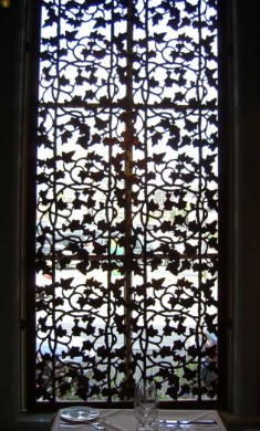 A grate bestowed with beautiful esthetics and used for security in the east side of Toronto.